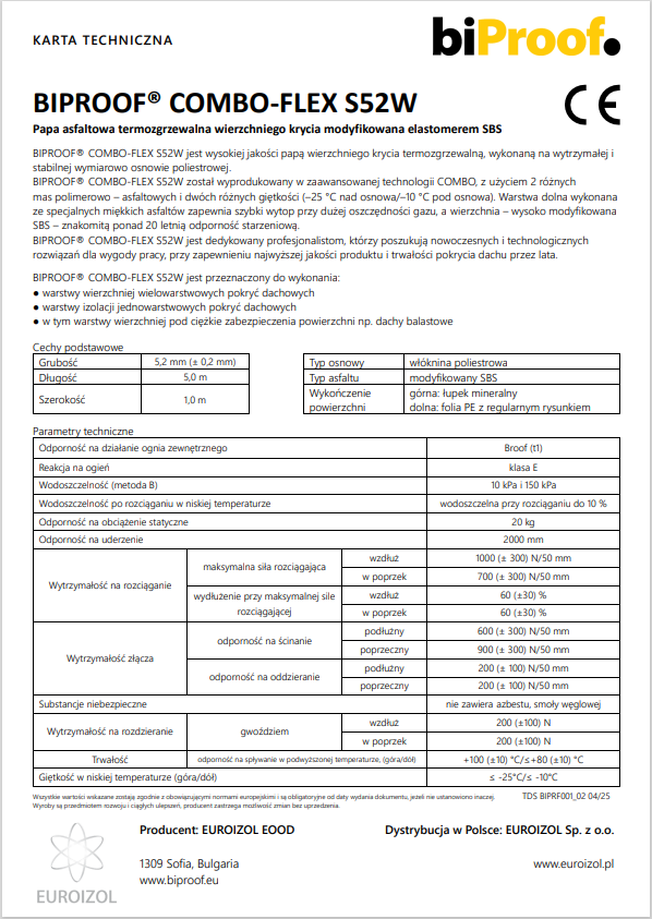 Wysokiej jakości membrana dachowa polimerowo-bitumiczna o grubości 5,2 mm (+/-10%), która wykonana jest z bitumu modyfikowanego SBS o giętkości -20 °C oraz z osnowy wzmacniającej z poliestru o wysokiej wytrzymałości. Stosowana jako warstwa wierzchnia w jednowarstwowych i dwuwarstwowych systemach dachowych.